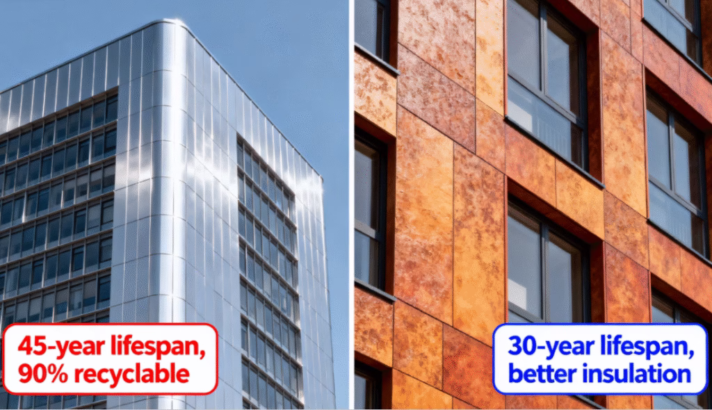 A quick showdown between two top dogs in facade materials—aluminum and composite. Let’s break down what really matters.